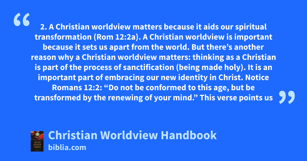 2. A Christian worldview matters because it aids our spiritual transformation (Rom 12:2a). A Christian worldview is important because it sets us apart from the world. But there’s another reason why a Christian worldview matters: thinking as a Christian is part of the process of sanctification (being made holy). It is an important part of embracing our new identity in Christ. Notice Romans 12:2: “Do not be conformed to this age, but be transformed by the renewing of your mind.” This verse points us