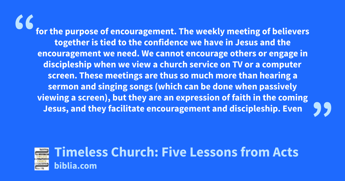 for the purpose of encouragement. The weekly meeting of believers together is tied to the confidence we have in Jesus and the encouragement we need. We cannot encourage others or engage in discipleship when we view a church service on TV or a computer screen. These meetings are thus so much more than hearing a sermon and singing songs (which can be done when passively viewing a screen), but they are an expression of faith in the coming Jesus, and they facilitate encouragement and discipleship. Even