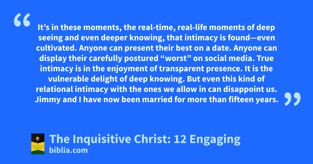 It’s in these moments, the real-time, real-life moments of deep seeing and even deeper knowing, that intimacy is found—even cultivated. Anyone can present their best on a date. Anyone can display their carefully postured “worst” on social media. True intimacy is in the enjoyment of transparent presence. It is the vulnerable delight of deep knowing. But even this kind of relational intimacy with the ones we allow in can disappoint us. Jimmy and I have now been married for more than fifteen years.