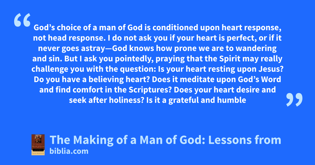 God’s choice of a man of God is conditioned upon heart response, not head response. I do not ask you if your heart is perfect, or if it never goes astray—God knows how prone we are to wandering and sin. But I ask you pointedly, praying that the Spirit may really challenge you with the question: Is your heart resting upon Jesus? Do you have a believing heart? Does it meditate upon God’s Word and find comfort in the Scriptures? Does your heart desire and seek after holiness? Is it a grateful and humble