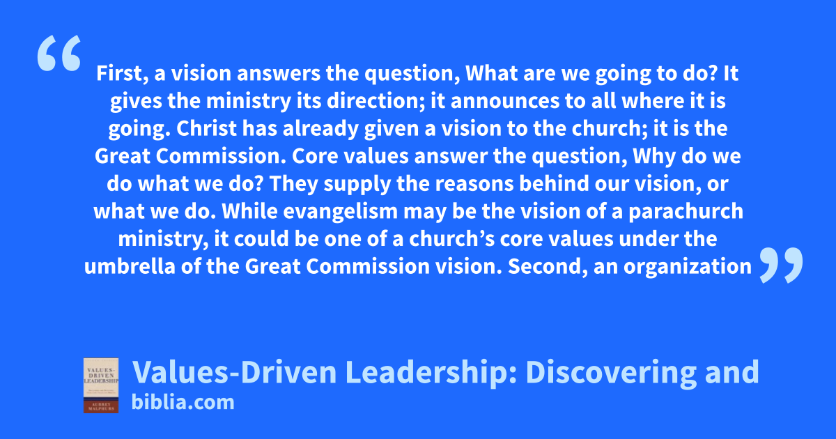 First, a vision answers the question, What are we going to do? It gives the ministry its direction; it announces to all where it is going. Christ has already given a vision to the church; it is the Great Commission. Core values answer the question, Why do we do what we do? They supply the reasons behind our vision, or what we do. While evangelism may be the vision of a parachurch ministry, it could be one of a church’s core values under the umbrella of the Great Commission vision. Second, an organization