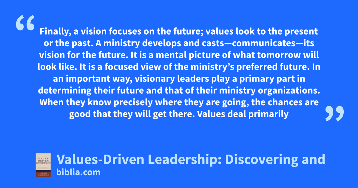 Finally, a vision focuses on the future; values look to the present or the past. A ministry develops and casts—communicates—its vision for the future. It is a mental picture of what tomorrow will look like. It is a focused view of the ministry’s preferred future. In an important way, visionary leaders play a primary part in determining their future and that of their ministry organizations. When they know precisely where they are going, the chances are good that they will get there. Values deal primarily