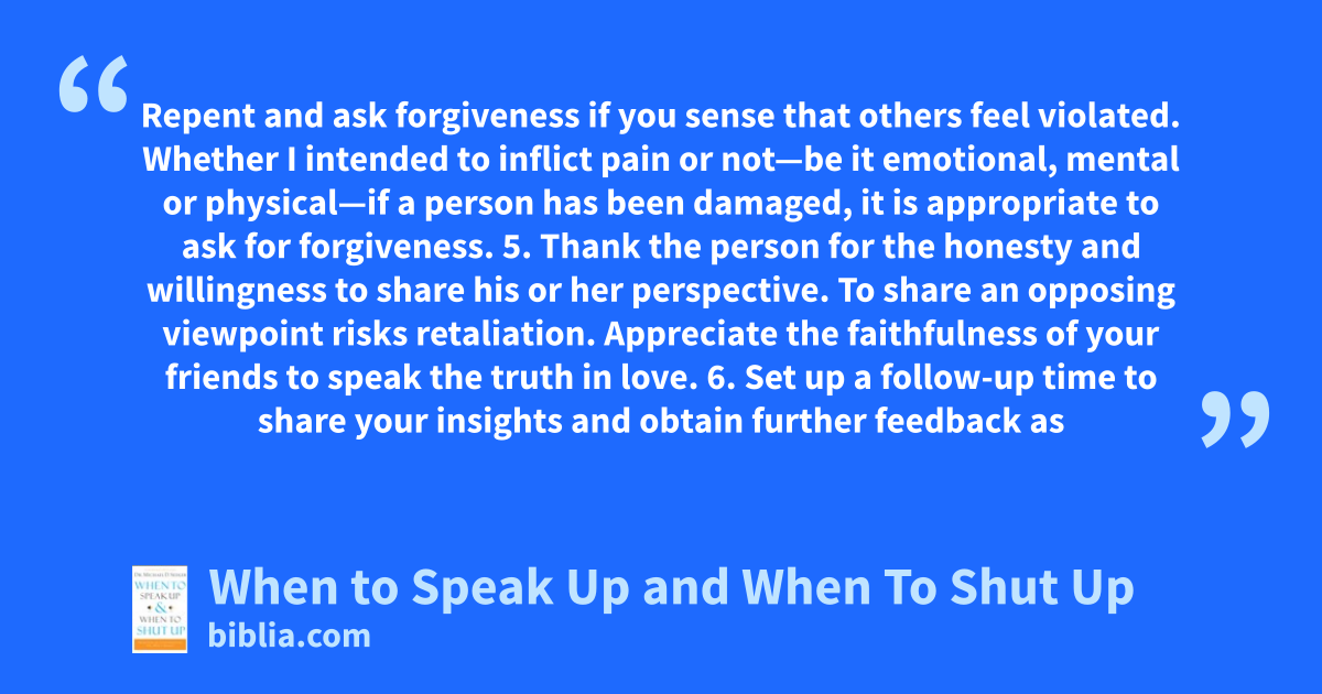 Repent and ask forgiveness if you sense that others feel violated. Whether I intended to inflict pain or not—be it emotional, mental or physical—if a person has been damaged, it is appropriate to ask for forgiveness. 5. Thank the person for the honesty and willingness to share his or her perspective. To share an opposing viewpoint risks retaliation. Appreciate the faithfulness of your friends to speak the truth in love. 6. Set up a follow-up time to share your insights and obtain further feedback as
