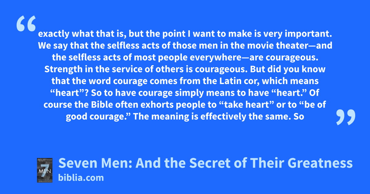 exactly what that is, but the point I want to make is very important. We say that the selfless acts of those men in the movie theater—and the selfless acts of most people everywhere—are courageous. Strength in the service of others is courageous. But did you know that the word courage comes from the Latin cor, which means “heart”? So to have courage simply means to have “heart.” Of course the Bible often exhorts people to “take heart” or to “be of good courage.” The meaning is effectively the same. So