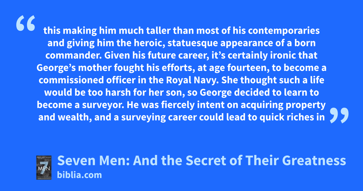 this making him much taller than most of his contemporaries and giving him the heroic, statuesque appearance of a born commander. Given his future career, it’s certainly ironic that George’s mother fought his efforts, at age fourteen, to become a commissioned officer in the Royal Navy. She thought such a life would be too harsh for her son, so George decided to learn to become a surveyor. He was fiercely intent on acquiring property and wealth, and a surveying career could lead to quick riches in