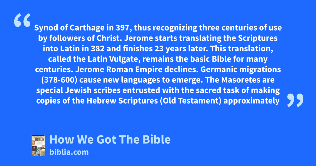 Synod of Carthage in 397, thus recognizing three centuries of use by followers of Christ. Jerome starts translating the Scriptures into Latin in 382 and finishes 23 years later. This translation, called the Latin Vulgate, remains the basic Bible for many centuries. Jerome Roman Empire declines. Germanic migrations (378-600) cause new languages to emerge. The Masoretes are special Jewish scribes entrusted with the sacred task of making copies of the Hebrew Scriptures (Old Testament) approximately