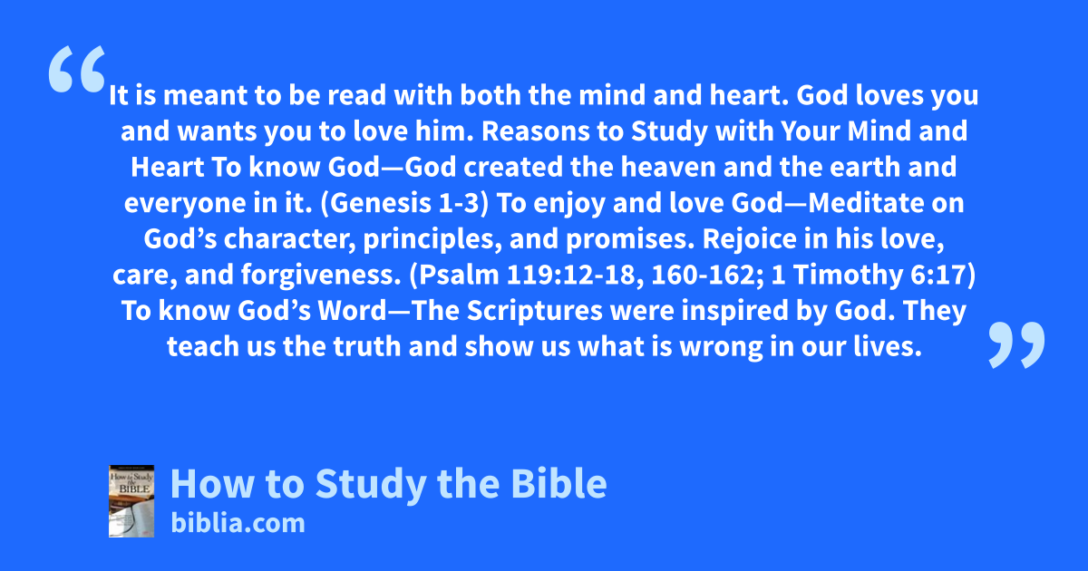 It is meant to be read with both the mind and heart. God loves you and wants you to love him. Reasons to Study with Your Mind and Heart To know God—God created the heaven and the earth and everyone in it. (Genesis 1-3) To enjoy and love God—Meditate on God’s character, principles, and promises. Rejoice in his love, care, and forgiveness. (Psalm 119:12-18, 160-162; 1 Timothy 6:17) To know God’s Word—The Scriptures were inspired by God. They teach us the truth and show us what is wrong in our lives.