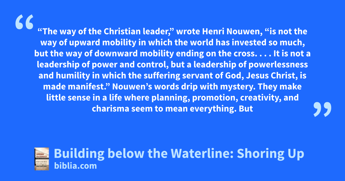 “The way of the Christian leader,” wrote Henri Nouwen, “is not the way of upward mobility in which the world has invested so much, but the way of downward mobility ending on the cross. . . . It is not a leadership of power and control, but a leadership of powerlessness and humility in which the suffering servant of God, Jesus Christ, is made manifest.” Nouwen’s words drip with mystery. They make little sense in a life where planning, promotion, creativity, and charisma seem to mean everything. But