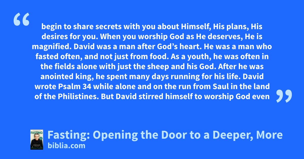 begin to share secrets with you about Himself, His plans, His desires for you. When you worship God as He deserves, He is magnified. David was a man after God’s heart. He was a man who fasted often, and not just from food. As a youth, he was often in the fields alone with just the sheep and his God. After he was anointed king, he spent many days running for his life. David wrote Psalm 34 while alone and on the run from Saul in the land of the Philistines. But David stirred himself to worship God even