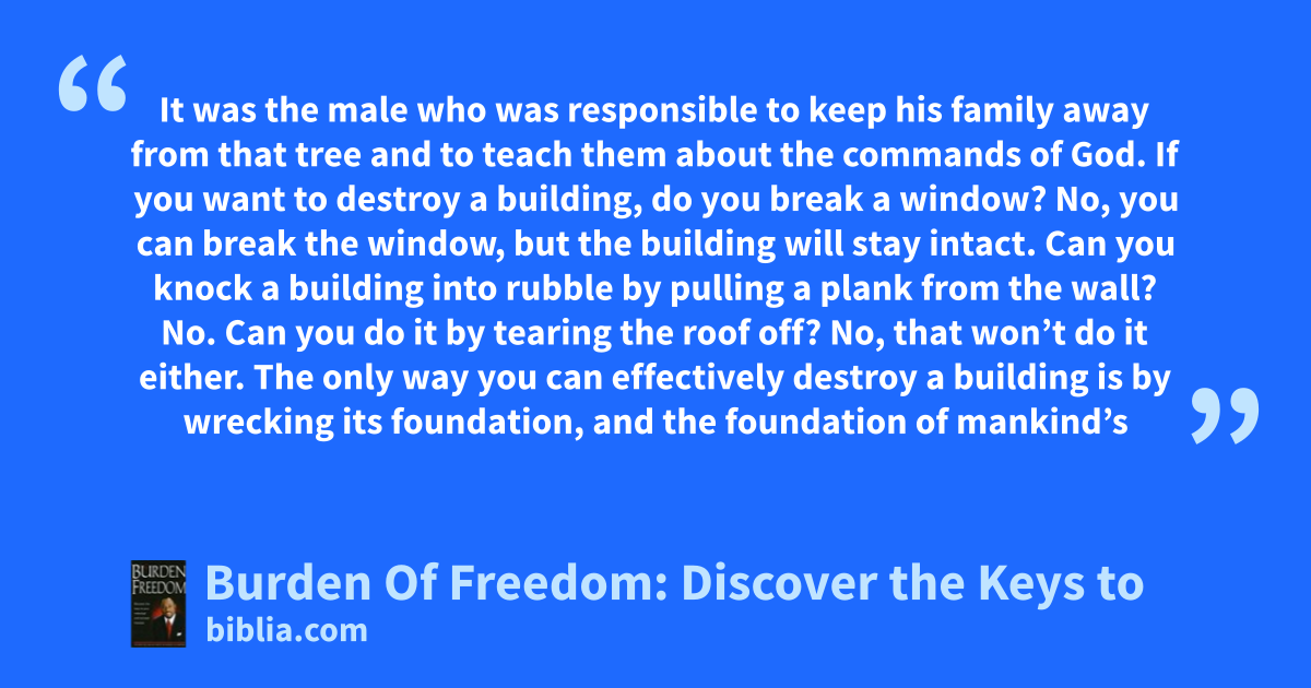 It was the male who was responsible to keep his family away from that tree and to teach them about the commands of God. If you want to destroy a building, do you break a window? No, you can break the window, but the building will stay intact. Can you knock a building into rubble by pulling a plank from the wall? No. Can you do it by tearing the roof off? No, that won’t do it either. The only way you can effectively destroy a building is by wrecking its foundation, and the foundation of mankind’s