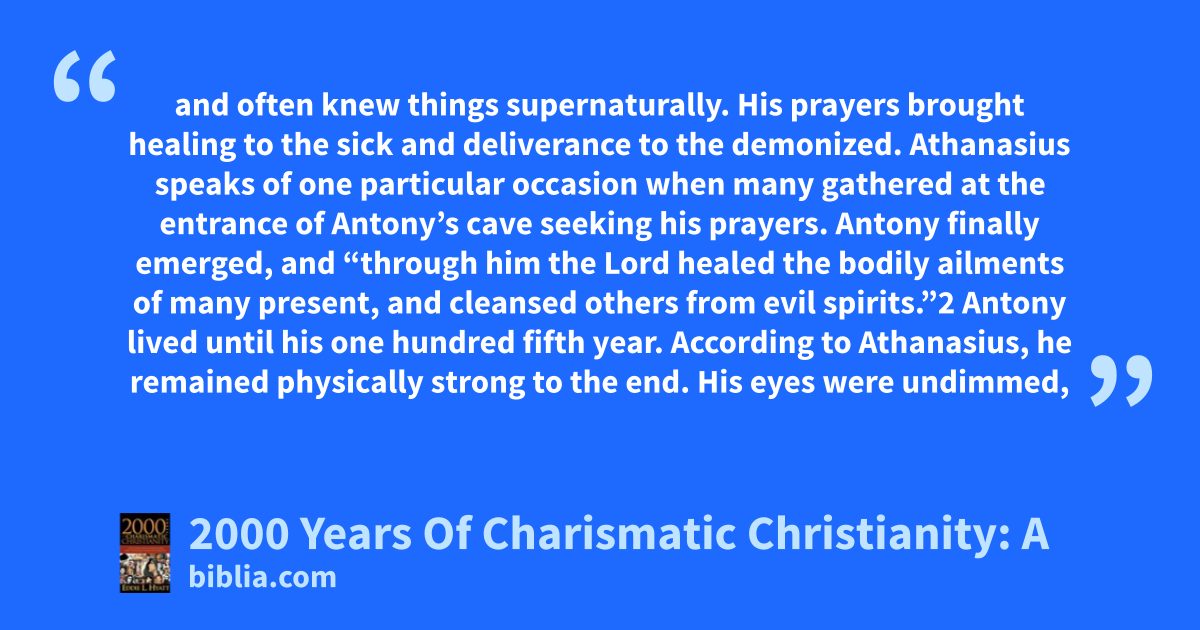 and often knew things supernaturally. His prayers brought healing to the sick and deliverance to the demonized. Athanasius speaks of one particular occasion when many gathered at the entrance of Antony’s cave seeking his prayers. Antony finally emerged, and “through him the Lord healed the bodily ailments of many present, and cleansed others from evil spirits.”2 Antony lived until his one hundred fifth year. According to Athanasius, he remained physically strong to the end. His eyes were undimmed,