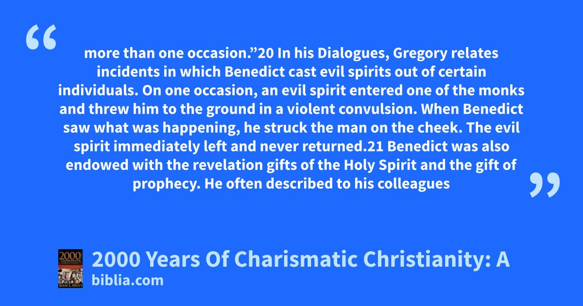 more than one occasion.”20 In his Dialogues, Gregory relates incidents in which Benedict cast evil spirits out of certain individuals. On one occasion, an evil spirit entered one of the monks and threw him to the ground in a violent convulsion. When Benedict saw what was happening, he struck the man on the cheek. The evil spirit immediately left and never returned.21 Benedict was also endowed with the revelation gifts of the Holy Spirit and the gift of prophecy. He often described to his colleagues
