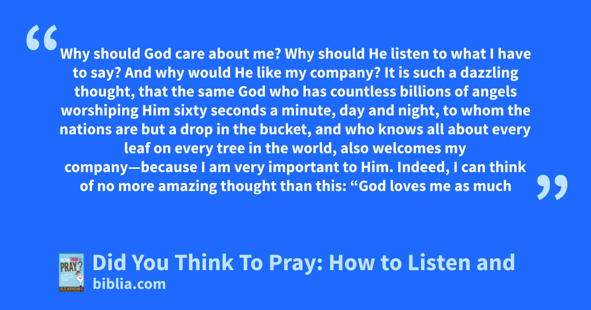 Why should God care about me? Why should He listen to what I have to say? And why would He like my company? It is such a dazzling thought, that the same God who has countless billions of angels worshiping Him sixty seconds a minute, day and night, to whom the nations are but a drop in the bucket, and who knows all about every leaf on every tree in the world, also welcomes my company—because I am very important to Him. Indeed, I can think of no more amazing thought than this: “God loves me as much
