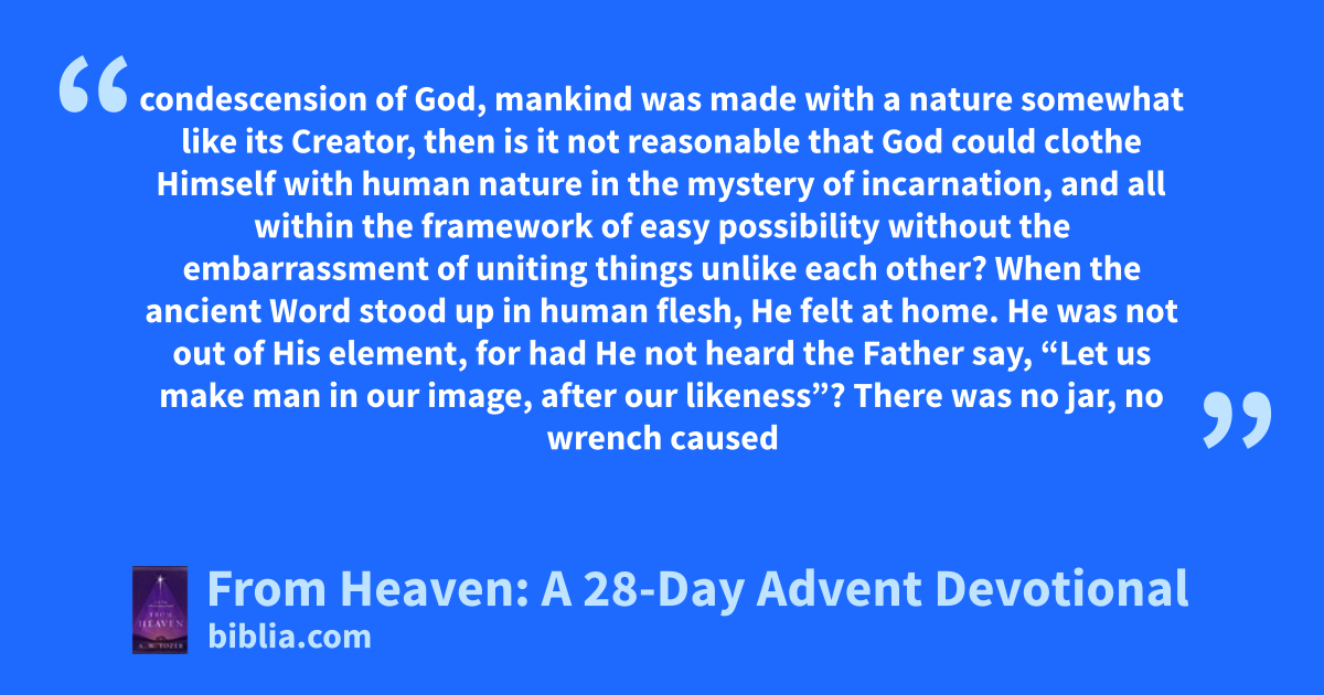condescension of God, mankind was made with a nature somewhat like its Creator, then is it not reasonable that God could clothe Himself with human nature in the mystery of incarnation, and all within the framework of easy possibility without the embarrassment of uniting things unlike each other? When the ancient Word stood up in human flesh, He felt at home. He was not out of His element, for had He not heard the Father say, “Let us make man in our image, after our likeness”? There was no jar, no wrench caused