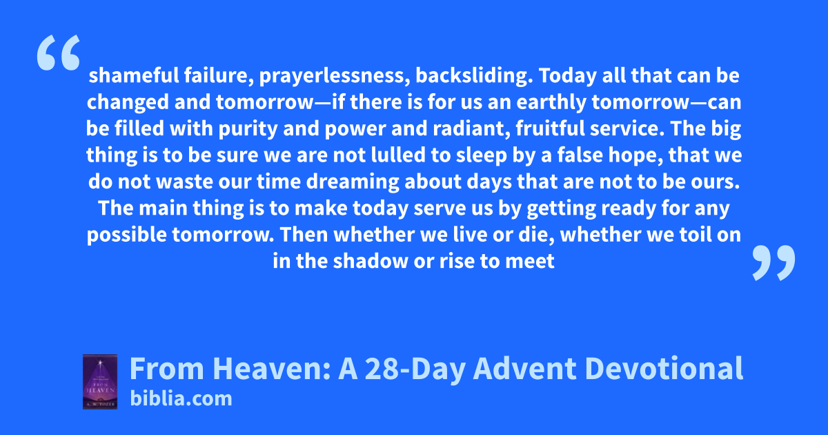 shameful failure, prayerlessness, backsliding. Today all that can be changed and tomorrow—if there is for us an earthly tomorrow—can be filled with purity and power and radiant, fruitful service. The big thing is to be sure we are not lulled to sleep by a false hope, that we do not waste our time dreaming about days that are not to be ours. The main thing is to make today serve us by getting ready for any possible tomorrow. Then whether we live or die, whether we toil on in the shadow or rise to meet