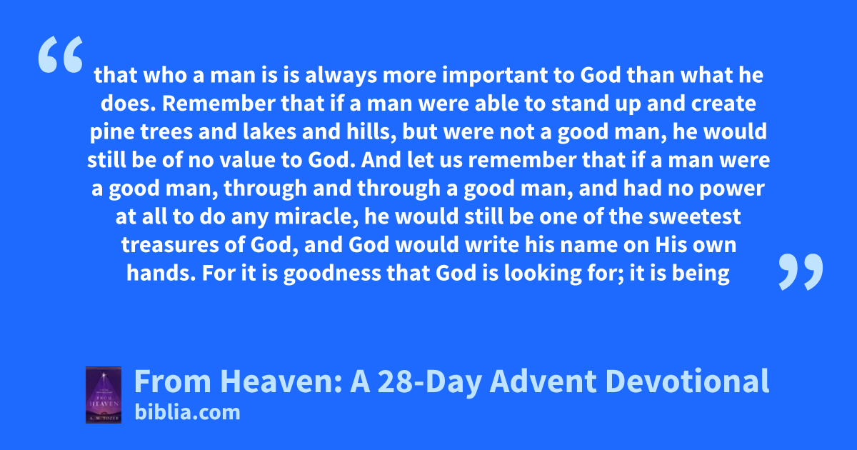 that who a man is is always more important to God than what he does. Remember that if a man were able to stand up and create pine trees and lakes and hills, but were not a good man, he would still be of no value to God. And let us remember that if a man were a good man, through and through a good man, and had no power at all to do any miracle, he would still be one of the sweetest treasures of God, and God would write his name on His own hands. For it is goodness that God is looking for; it is being