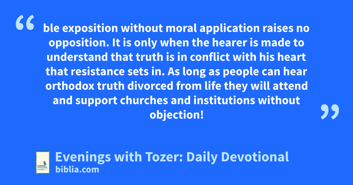 ble exposition without moral application raises no opposition. It is only when the hearer is made to understand that truth is in conflict with his heart that resistance sets in. As long as people can hear orthodox truth divorced from life they will attend and support churches and institutions without objection!
