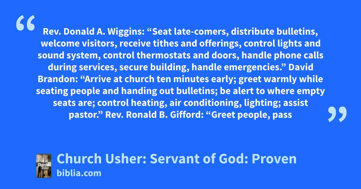 Rev. Donald A. Wiggins: “Seat late-comers, distribute bulletins, welcome visitors, receive tithes and offerings, control lights and sound system, control thermostats and doors, handle phone calls during services, secure building, handle emergencies.” David Brandon: “Arrive at church ten minutes early; greet warmly while seating people and handing out bulletins; be alert to where empty seats are; control heating, air conditioning, lighting; assist pastor.” Rev. Ronald B. Gifford: “Greet people, pass
