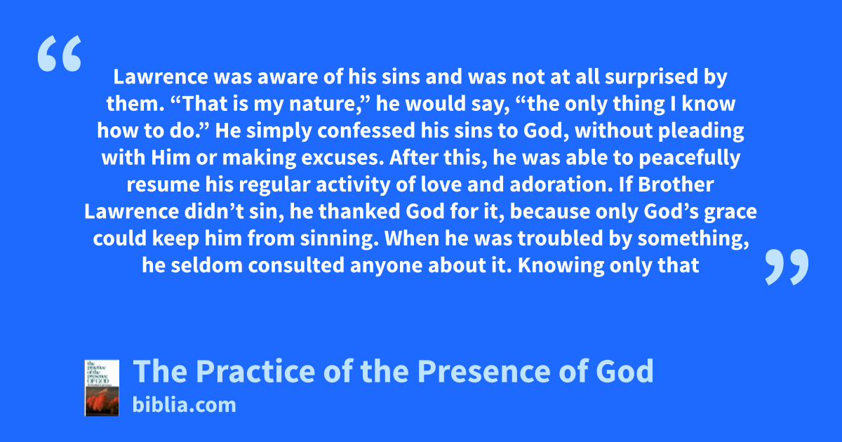 Lawrence was aware of his sins and was not at all surprised by them. “That is my nature,” he would say, “the only thing I know how to do.” He simply confessed his sins to God, without pleading with Him or making excuses. After this, he was able to peacefully resume his regular activity of love and adoration. If Brother Lawrence didn’t sin, he thanked God for it, because only God’s grace could keep him from sinning. When he was troubled by something, he seldom consulted anyone about it. Knowing only that