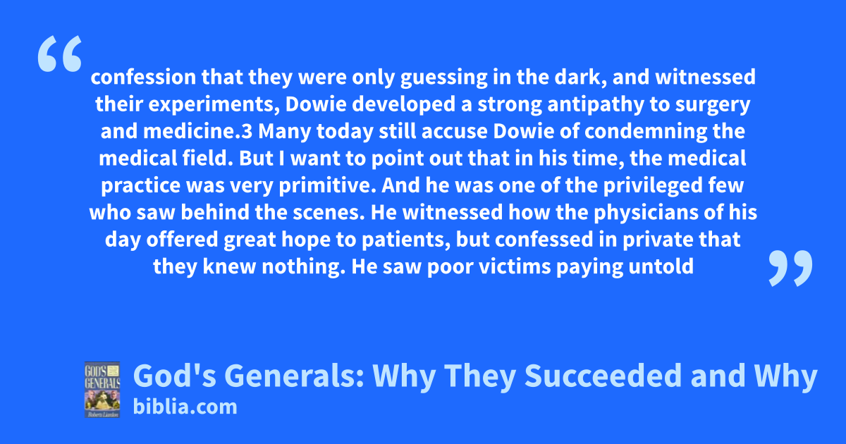 confession that they were only guessing in the dark, and witnessed their experiments, Dowie developed a strong antipathy to surgery and medicine.3 Many today still accuse Dowie of condemning the medical field. But I want to point out that in his time, the medical practice was very primitive. And he was one of the privileged few who saw behind the scenes. He witnessed how the physicians of his day offered great hope to patients, but confessed in private that they knew nothing. He saw poor victims paying untold