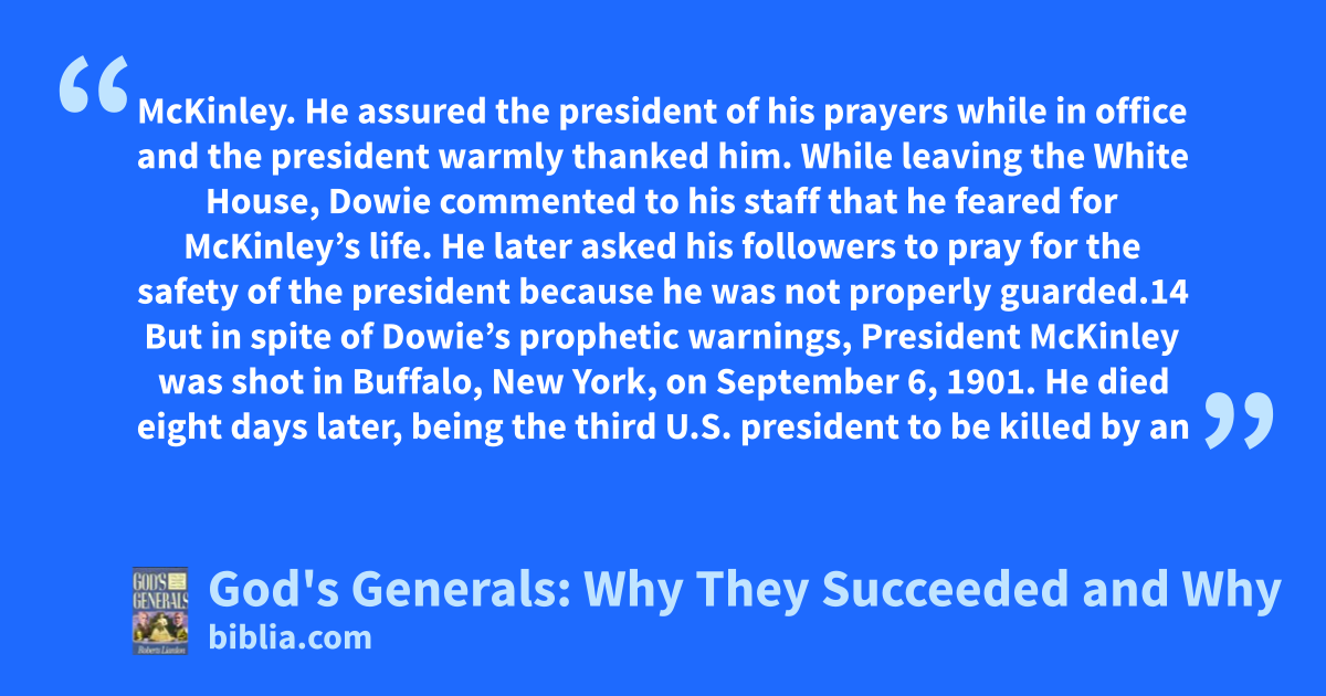 McKinley. He assured the president of his prayers while in office and the president warmly thanked him. While leaving the White House, Dowie commented to his staff that he feared for McKinley’s life. He later asked his followers to pray for the safety of the president because he was not properly guarded.14 But in spite of Dowie’s prophetic warnings, President McKinley was shot in Buffalo, New York, on September 6, 1901. He died eight days later, being the third U.S. president to be killed by an