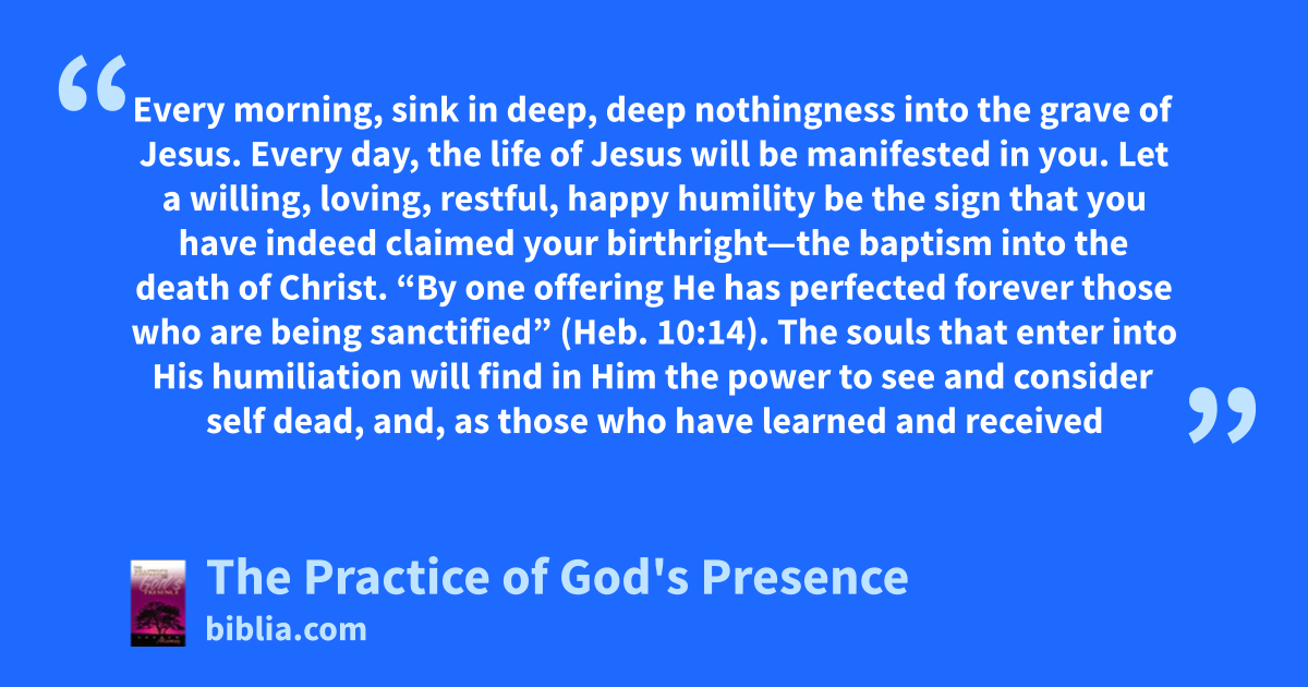 Every morning, sink in deep, deep nothingness into the grave of Jesus. Every day, the life of Jesus will be manifested in you. Let a willing, loving, restful, happy humility be the sign that you have indeed claimed your birthright—the baptism into the death of Christ. “By one offering He has perfected forever those who are being sanctified” (Heb. 10:14). The souls that enter into His humiliation will find in Him the power to see and consider self dead, and, as those who have learned and received