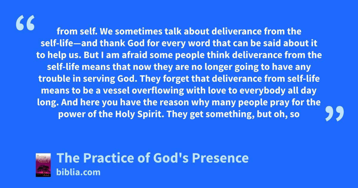 from self. We sometimes talk about deliverance from the self-life—and thank God for every word that can be said about it to help us. But I am afraid some people think deliverance from the self-life means that now they are no longer going to have any trouble in serving God. They forget that deliverance from self-life means to be a vessel overflowing with love to everybody all day long. And here you have the reason why many people pray for the power of the Holy Spirit. They get something, but oh, so