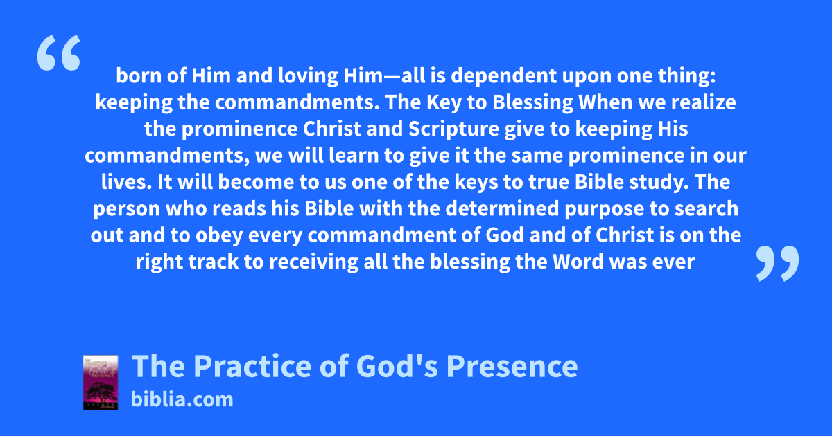 born of Him and loving Him—all is dependent upon one thing: keeping the commandments. The Key to Blessing When we realize the prominence Christ and Scripture give to keeping His commandments, we will learn to give it the same prominence in our lives. It will become to us one of the keys to true Bible study. The person who reads his Bible with the determined purpose to search out and to obey every commandment of God and of Christ is on the right track to receiving all the blessing the Word was ever