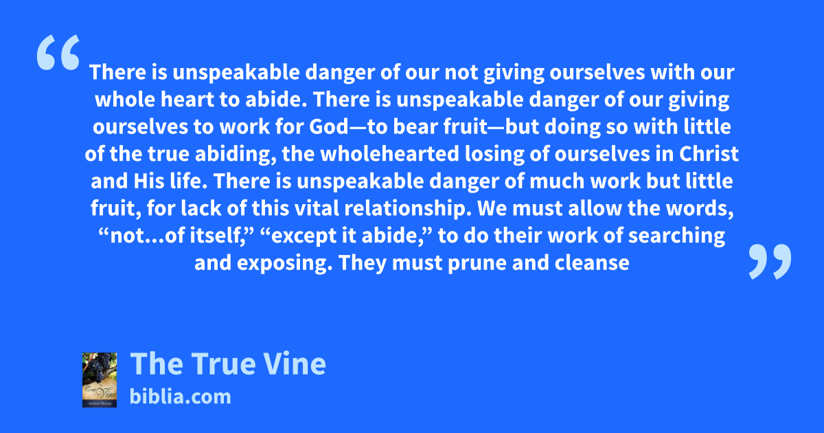 There is unspeakable danger of our not giving ourselves with our whole heart to abide. There is unspeakable danger of our giving ourselves to work for God—to bear fruit—but doing so with little of the true abiding, the wholehearted losing of ourselves in Christ and His life. There is unspeakable danger of much work but little fruit, for lack of this vital relationship. We must allow the words, “not...of itself,” “except it abide,” to do their work of searching and exposing. They must prune and cleanse