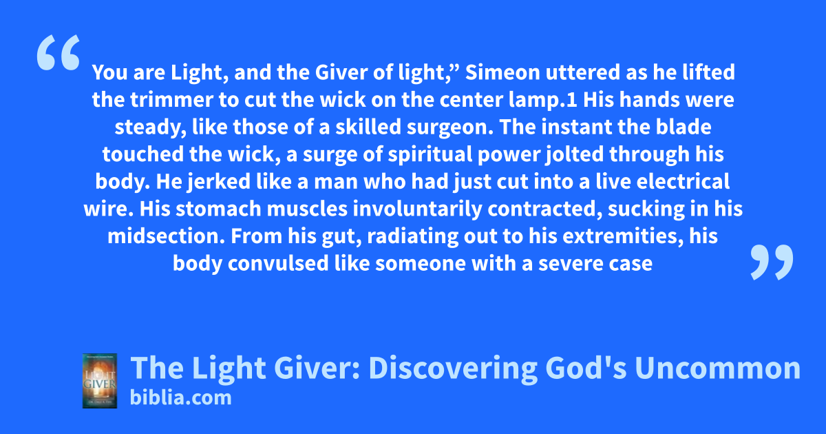 You are Light, and the Giver of light,” Simeon uttered as he lifted the trimmer to cut the wick on the center lamp.1 His hands were steady, like those of a skilled surgeon. The instant the blade touched the wick, a surge of spiritual power jolted through his body. He jerked like a man who had just cut into a live electrical wire. His stomach muscles involuntarily contracted, sucking in his midsection. From his gut, radiating out to his extremities, his body convulsed like someone with a severe case