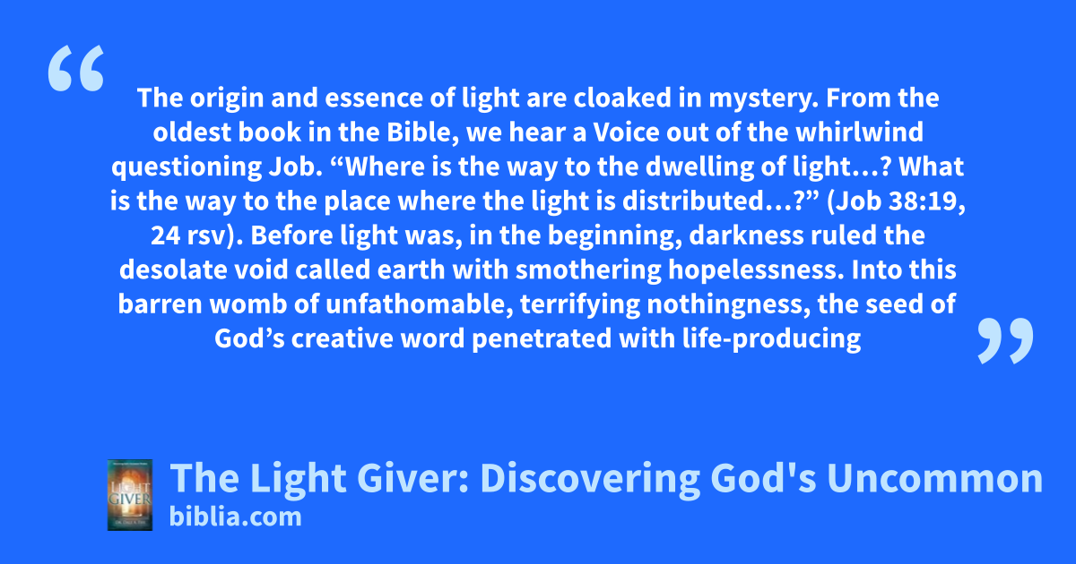 The origin and essence of light are cloaked in mystery. From the oldest book in the Bible, we hear a Voice out of the whirlwind questioning Job. “Where is the way to the dwelling of light…? What is the way to the place where the light is distributed…?” (Job 38:19, 24 rsv). Before light was, in the beginning, darkness ruled the desolate void called earth with smothering hopelessness. Into this barren womb of unfathomable, terrifying nothingness, the seed of God’s creative word penetrated with life-producing