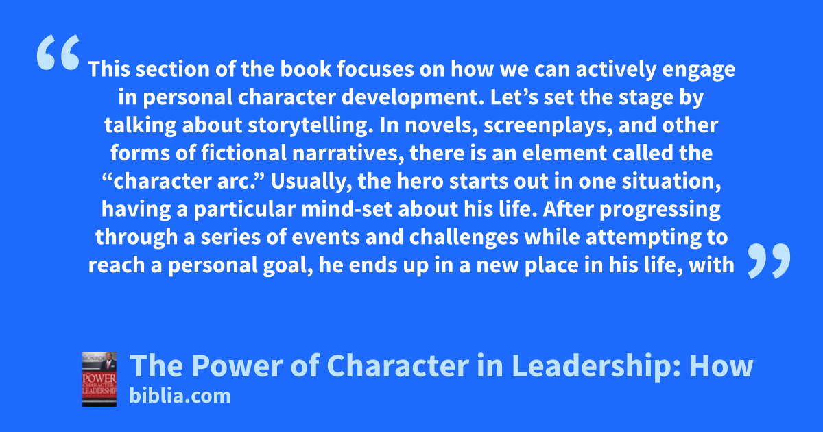This section of the book focuses on how we can actively engage in personal character development. Let’s set the stage by talking about storytelling. In novels, screenplays, and other forms of fictional narratives, there is an element called the “character arc.” Usually, the hero starts out in one situation, having a particular mind-set about his life. After progressing through a series of events and challenges while attempting to reach a personal goal, he ends up in a new place in his life, with
