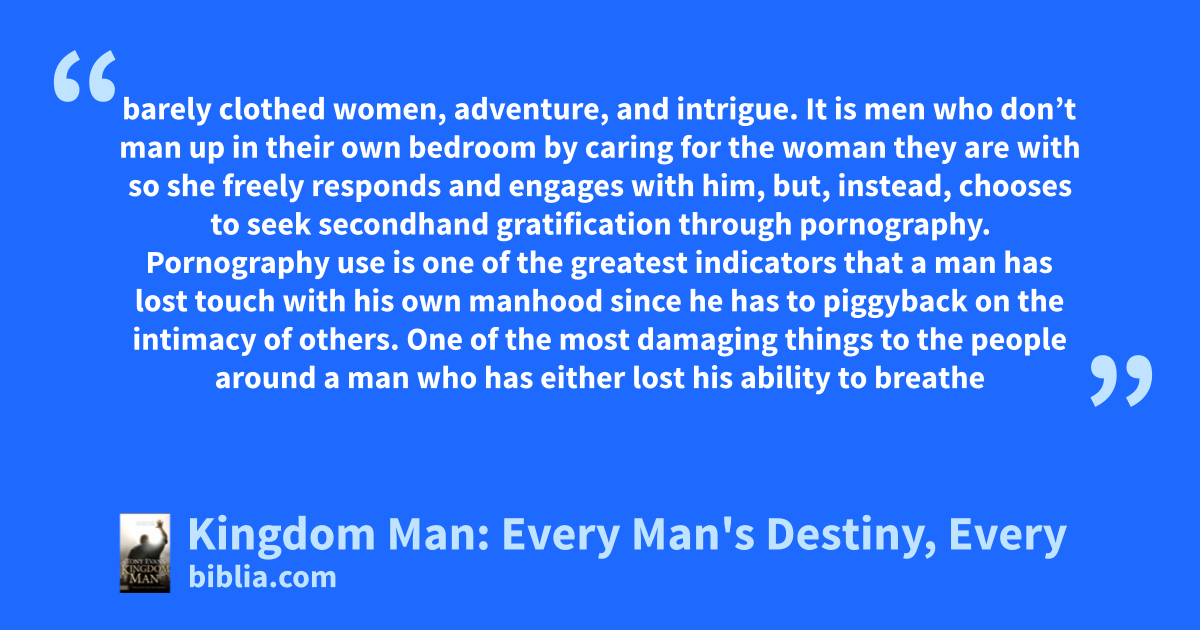 barely clothed women, adventure, and intrigue. It is men who don’t man up in their own bedroom by caring for the woman they are with so she freely responds and engages with him, but, instead, chooses to seek secondhand gratification through pornography. Pornography use is one of the greatest indicators that a man has lost touch with his own manhood since he has to piggyback on the intimacy of others. One of the most damaging things to the people around a man who has either lost his ability to breathe