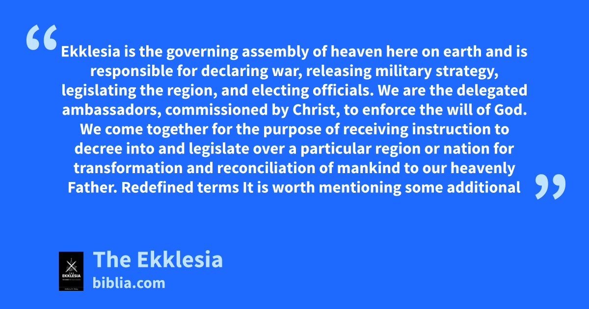 Ekklesia is the governing assembly of heaven here on earth and is responsible for declaring war, releasing military strategy, legislating the region, and electing officials. We are the delegated ambassadors, commissioned by Christ, to enforce the will of God. We come together for the purpose of receiving instruction to decree into and legislate over a particular region or nation for transformation and reconciliation of mankind to our heavenly Father. Redefined terms It is worth mentioning some additional