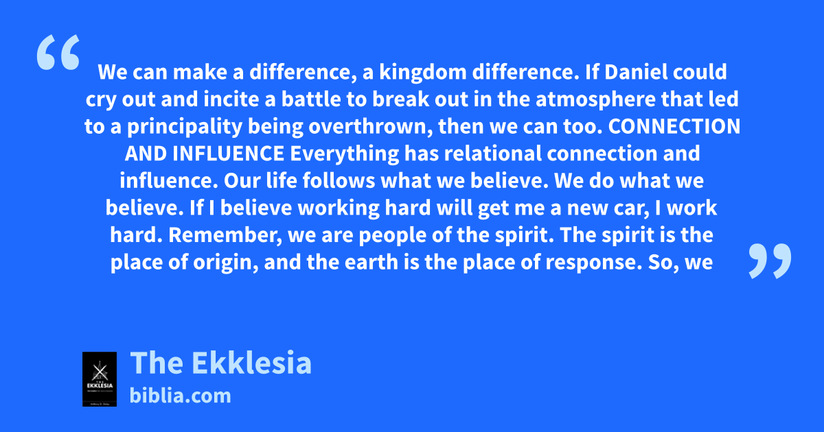We can make a difference, a kingdom difference. If Daniel could cry out and incite a battle to break out in the atmosphere that led to a principality being overthrown, then we can too. CONNECTION AND INFLUENCE Everything has relational connection and influence. Our life follows what we believe. We do what we believe. If I believe working hard will get me a new car, I work hard. Remember, we are people of the spirit. The spirit is the place of origin, and the earth is the place of response. So, we