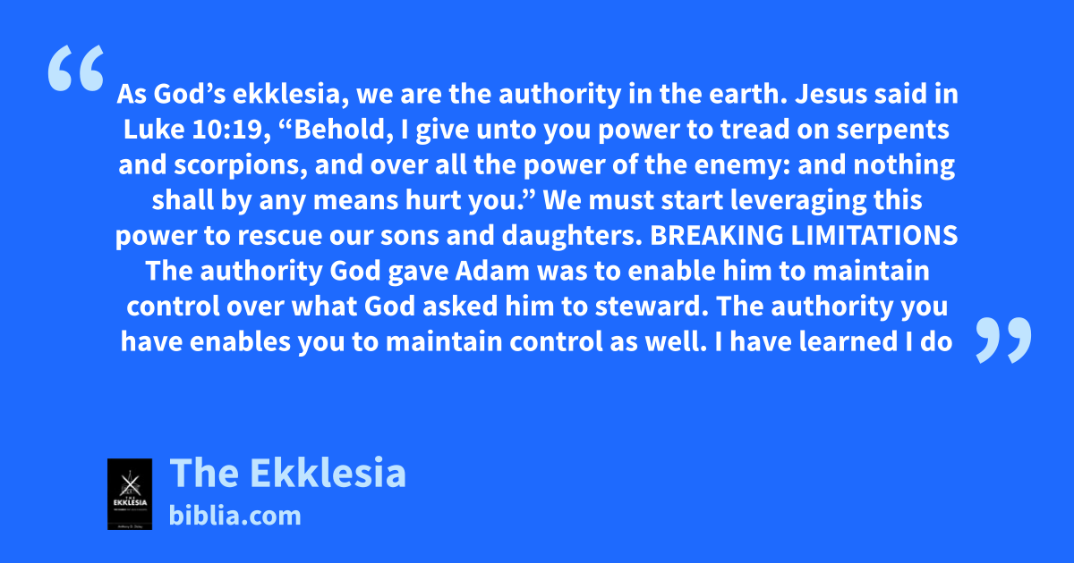 As God’s ekklesia, we are the authority in the earth. Jesus said in Luke 10:19, “Behold, I give unto you power to tread on serpents and scorpions, and over all the power of the enemy: and nothing shall by any means hurt you.” We must start leveraging this power to rescue our sons and daughters. BREAKING LIMITATIONS The authority God gave Adam was to enable him to maintain control over what God asked him to steward. The authority you have enables you to maintain control as well. I have learned I do