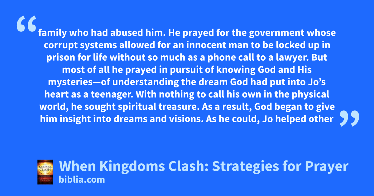 family who had abused him. He prayed for the government whose corrupt systems allowed for an innocent man to be locked up in prison for life without so much as a phone call to a lawyer. But most of all he prayed in pursuit of knowing God and His mysteries—of understanding the dream God had put into Jo’s heart as a teenager. With nothing to call his own in the physical world, he sought spiritual treasure. As a result, God began to give him insight into dreams and visions. As he could, Jo helped other