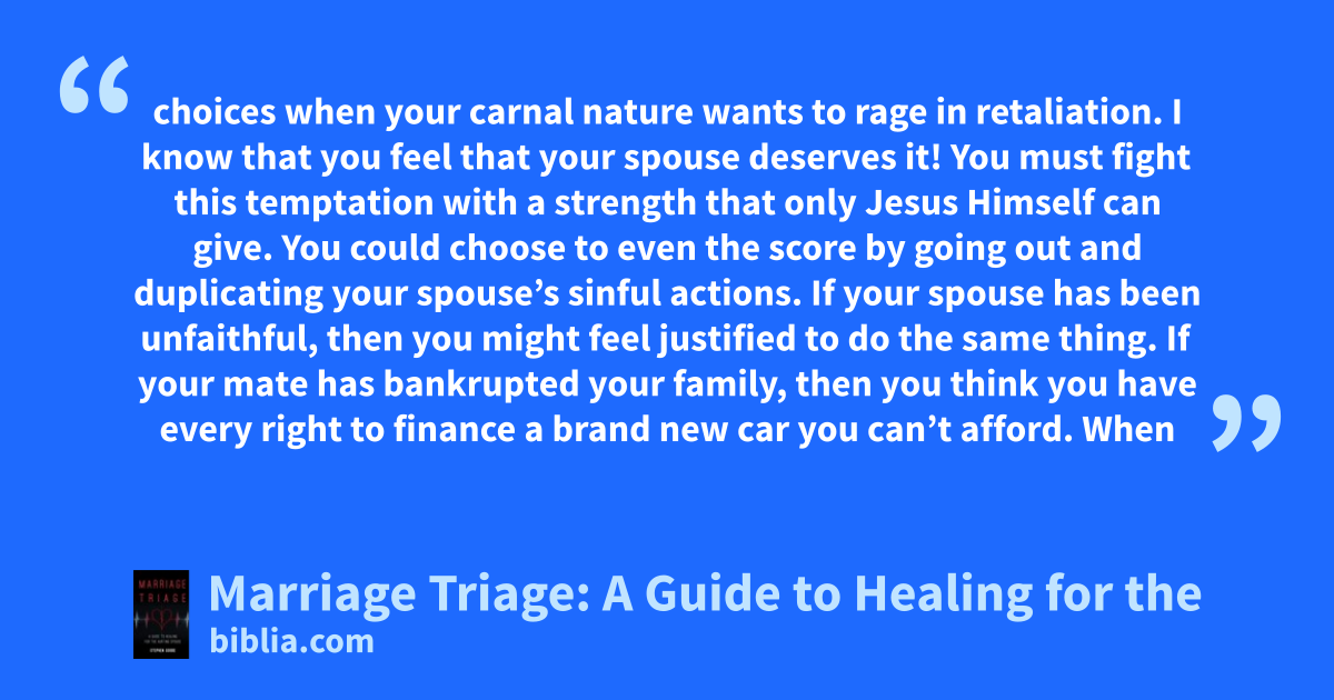 choices when your carnal nature wants to rage in retaliation. I know that you feel that your spouse deserves it! You must fight this temptation with a strength that only Jesus Himself can give. You could choose to even the score by going out and duplicating your spouse’s sinful actions. If your spouse has been unfaithful, then you might feel justified to do the same thing. If your mate has bankrupted your family, then you think you have every right to finance a brand new car you can’t afford. When