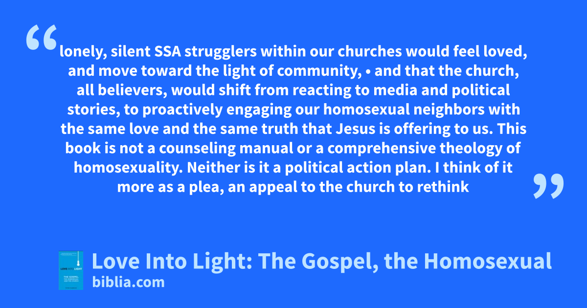 lonely, silent SSA strugglers within our churches would feel loved, and move toward the light of community, • and that the church, all believers, would shift from reacting to media and political stories, to proactively engaging our homosexual neighbors with the same love and the same truth that Jesus is offering to us. This book is not a counseling manual or a comprehensive theology of homosexuality. Neither is it a political action plan. I think of it more as a plea, an appeal to the church to rethink