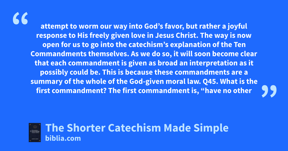 attempt to worm our way into God’s favor, but rather a joyful response to His freely given love in Jesus Christ. The way is now open for us to go into the catechism’s explanation of the Ten Commandments themselves. As we do so, it will soon become clear that each commandment is given as broad an interpretation as it possibly could be. This is because these commandments are a summary of the whole of the God-given moral law. Q45. What is the first commandment? The first commandment is, “have no other