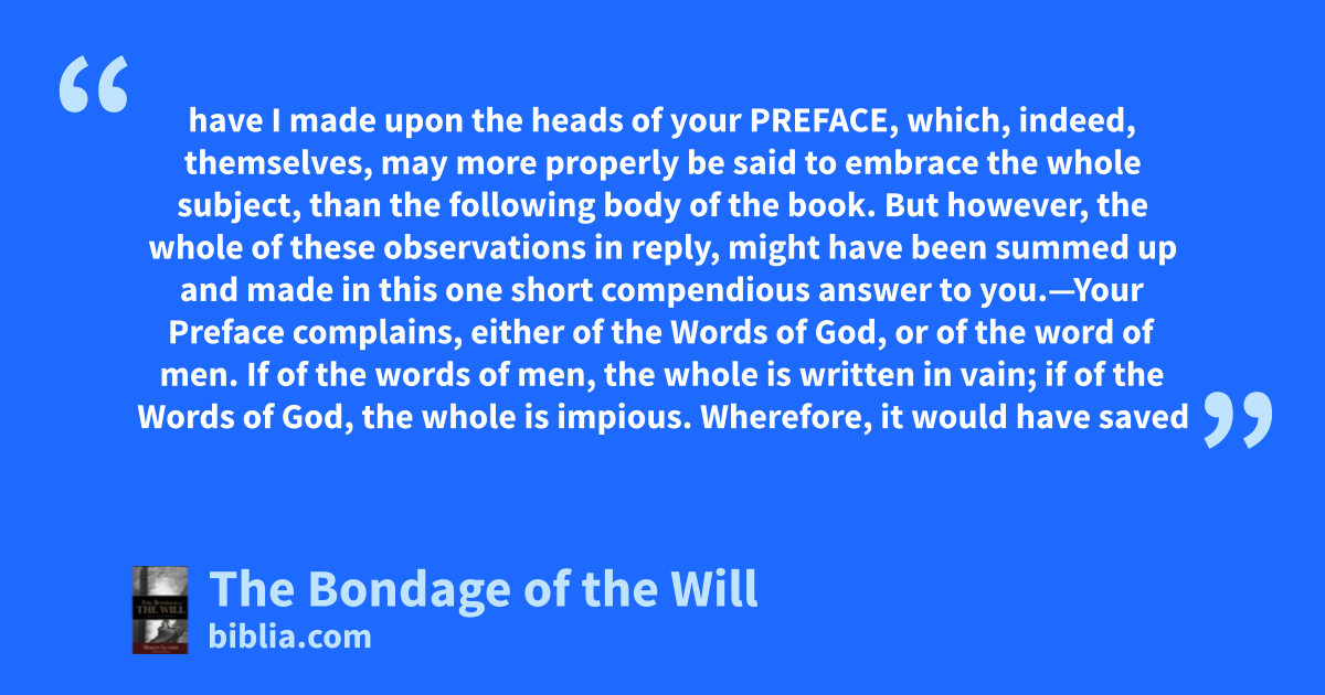 Acknowledged by theologians as one of the great masterpieces of the Reformation, Martin Luther's Bondage of the Will was also Luther's favorite work. Luther responds to Desiderius Erasmus' Diatribe on Free Will with the bluntness, genius, sarcasm, and spirituality that were as much a part of his writing as they were of his colorful personality. Luther writes lucidly on the themes of man's...