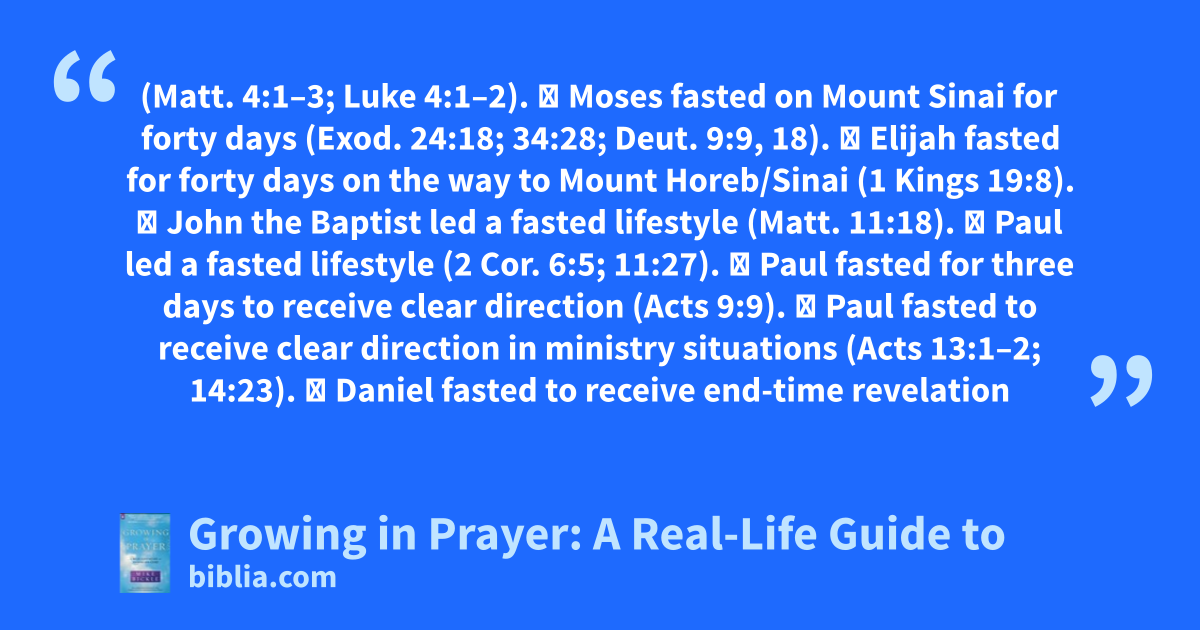 (Matt. 4:1–3; Luke 4:1–2). ✦ Moses fasted on Mount Sinai for forty days (Exod. 24:18; 34:28; Deut. 9:9, 18). ✦ Elijah fasted for forty days on the way to Mount Horeb/Sinai (1 Kings 19:8). ✦ John the Baptist led a fasted lifestyle (Matt. 11:18). ✦ Paul led a fasted lifestyle (2 Cor. 6:5; 11:27). ✦ Paul fasted for three days to receive clear direction (Acts 9:9). ✦ Paul fasted to receive clear direction in ministry situations (Acts 13:1–2; 14:23). ✦ Daniel fasted to receive end-time revelation