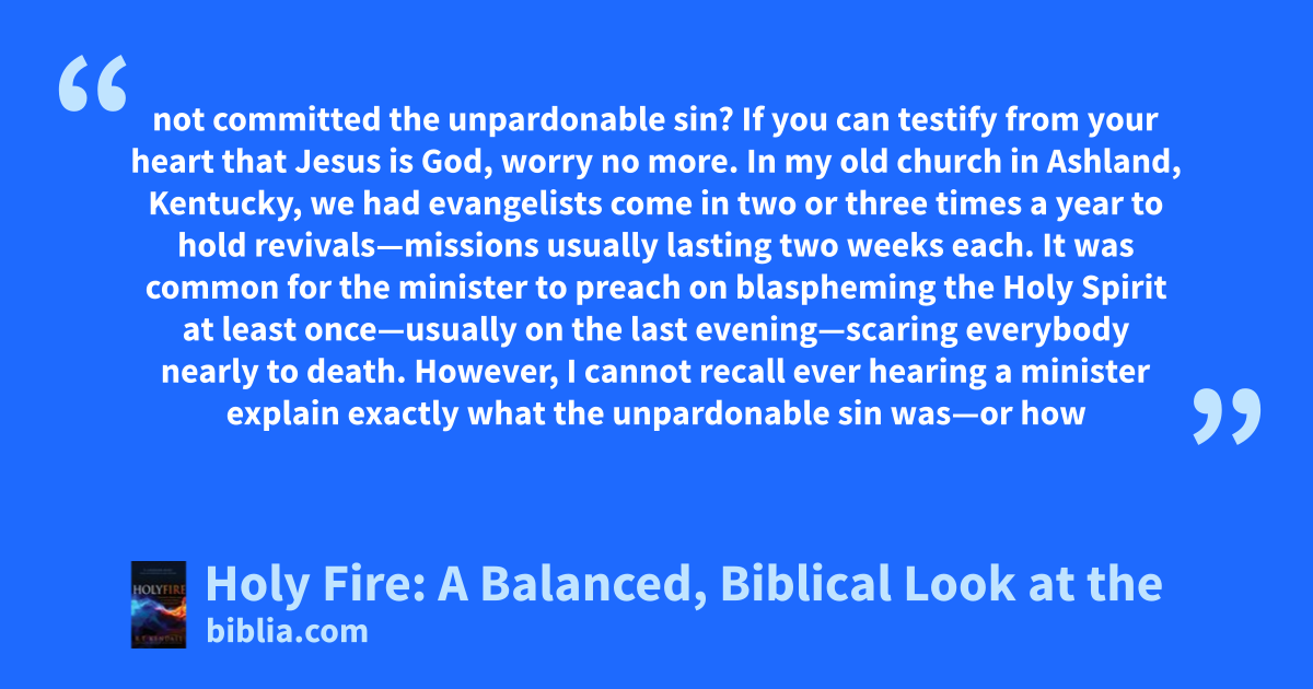 not committed the unpardonable sin? If you can testify from your heart that Jesus is God, worry no more. In my old church in Ashland, Kentucky, we had evangelists come in two or three times a year to hold revivals—missions usually lasting two weeks each. It was common for the minister to preach on blaspheming the Holy Spirit at least once—usually on the last evening—scaring everybody nearly to death. However, I cannot recall ever hearing a minister explain exactly what the unpardonable sin was—or how