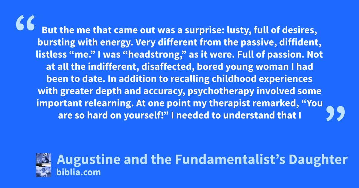 But the me that came out was a surprise: lusty, full of desires, bursting with energy. Very different from the passive, diffident, listless “me.” I was “headstrong,” as it were. Full of passion. Not at all the indifferent, disaffected, bored young woman I had been to date. In addition to recalling childhood experiences with greater depth and accuracy, psychotherapy involved some important relearning. At one point my therapist remarked, “You are so hard on yourself!” I needed to understand that I
