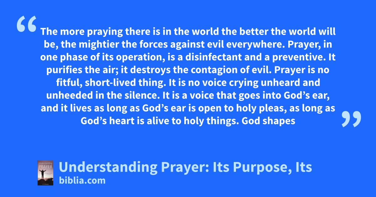 The more praying there is in the world the better the world will be, the mightier the forces against evil everywhere. Prayer, in one phase of its operation, is a disinfectant and a preventive. It purifies the air; it destroys the contagion of evil. Prayer is no fitful, short-lived thing. It is no voice crying unheard and unheeded in the silence. It is a voice that goes into God’s ear, and it lives as long as God’s ear is open to holy pleas, as long as God’s heart is alive to holy things. God shapes