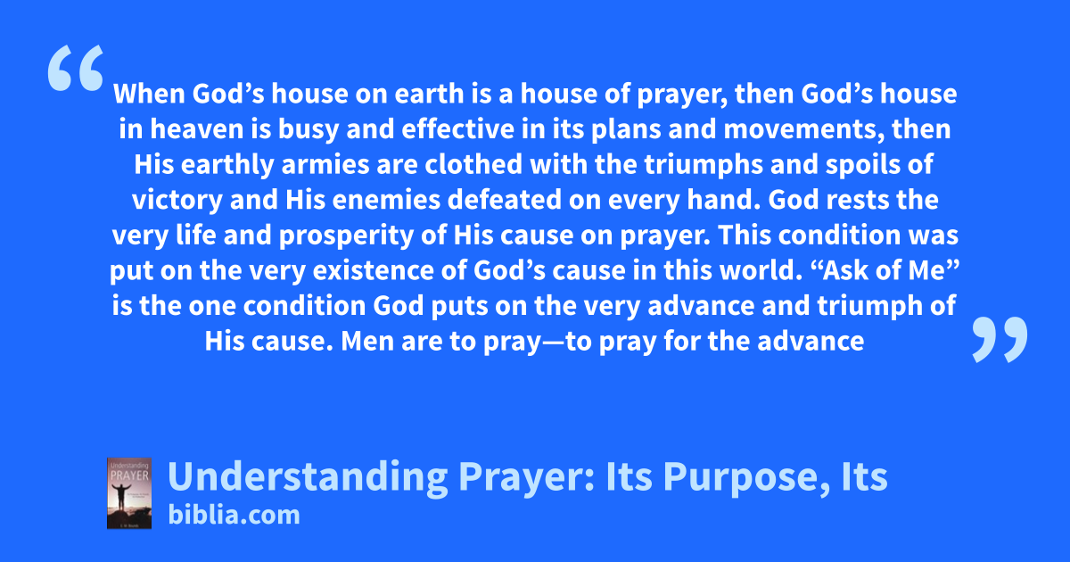 When God’s house on earth is a house of prayer, then God’s house in heaven is busy and effective in its plans and movements, then His earthly armies are clothed with the triumphs and spoils of victory and His enemies defeated on every hand. God rests the very life and prosperity of His cause on prayer. This condition was put on the very existence of God’s cause in this world. “Ask of Me” is the one condition God puts on the very advance and triumph of His cause. Men are to pray—to pray for the advance