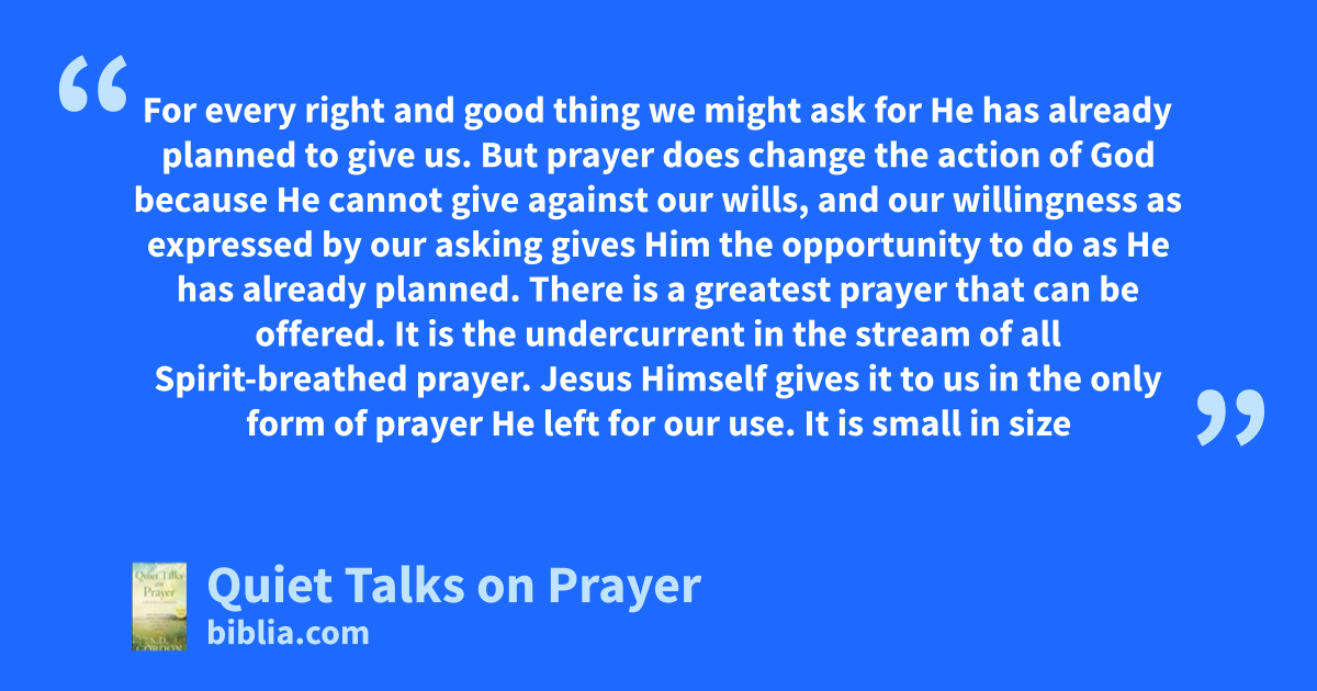 For every right and good thing we might ask for He has already planned to give us. But prayer does change the action of God because He cannot give against our wills, and our willingness as expressed by our asking gives Him the opportunity to do as He has already planned. There is a greatest prayer that can be offered. It is the undercurrent in the stream of all Spirit-breathed prayer. Jesus Himself gives it to us in the only form of prayer He left for our use. It is small in size
