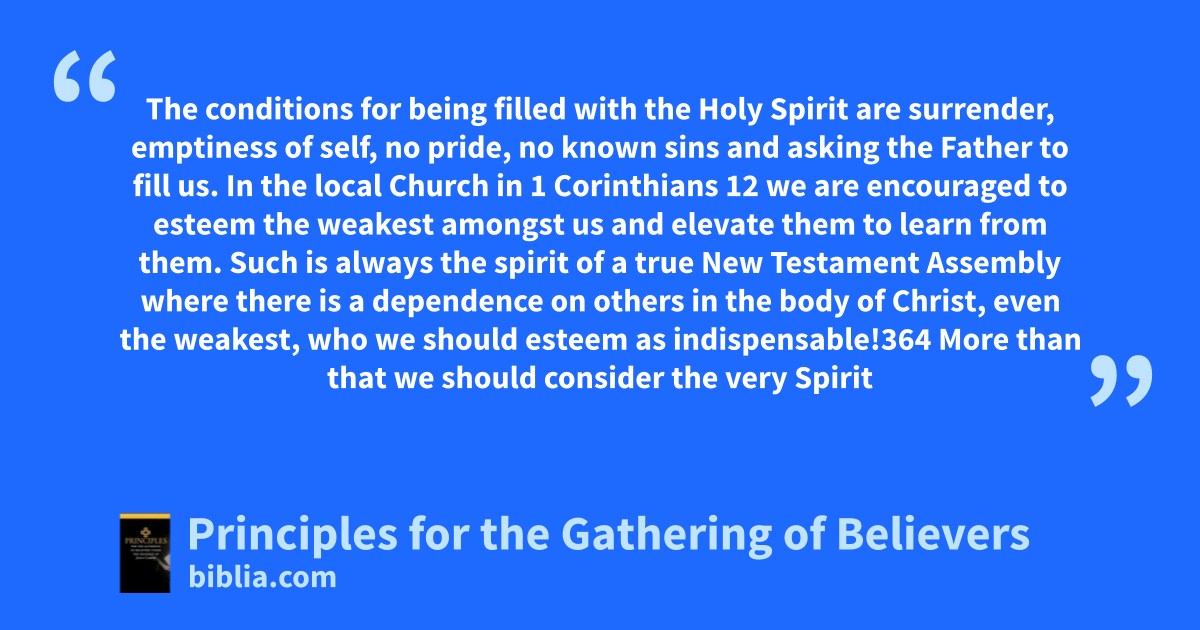 The conditions for being filled with the Holy Spirit are surrender, emptiness of self, no pride, no known sins and asking the Father to fill us. In the local Church in 1 Corinthians 12 we are encouraged to esteem the weakest amongst us and elevate them to learn from them. Such is always the spirit of a true New Testament Assembly where there is a dependence on others in the body of Christ, even the weakest, who we should esteem as indispensable!364 More than that we should consider the very Spirit