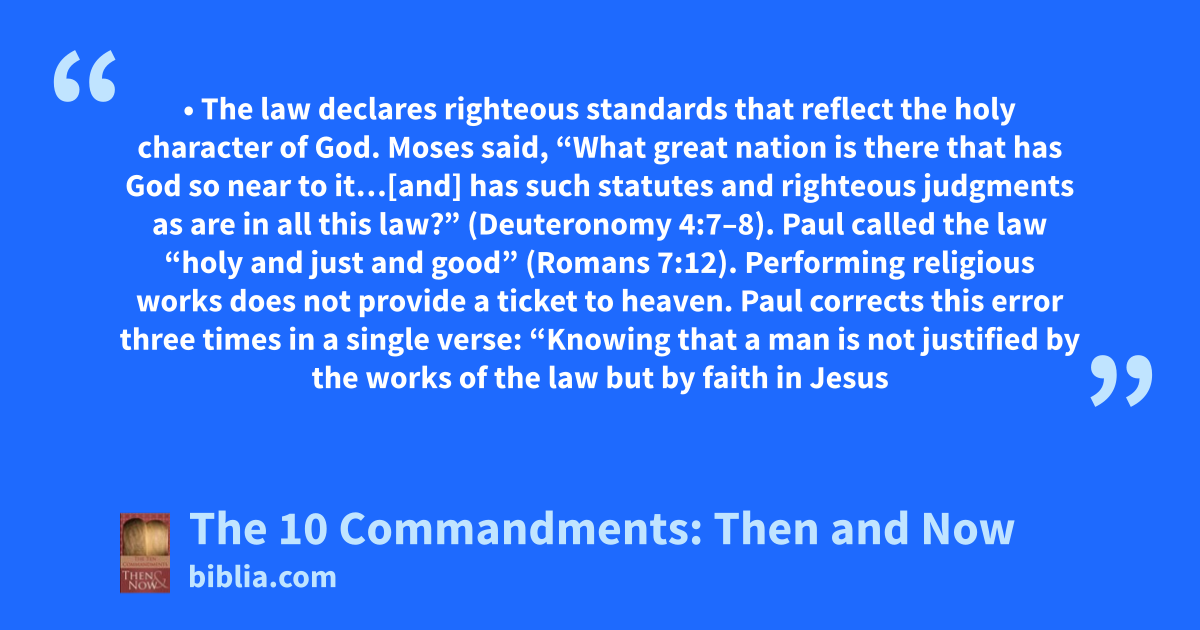 • The law declares righteous standards that reflect the holy character of God. Moses said, “What great nation is there that has God so near to it…[and] has such statutes and righteous judgments as are in all this law?” (Deuteronomy 4:7–8). Paul called the law “holy and just and good” (Romans 7:12). Performing religious works does not provide a ticket to heaven. Paul corrects this error three times in a single verse: “Knowing that a man is not justified by the works of the law but by faith in Jesus
