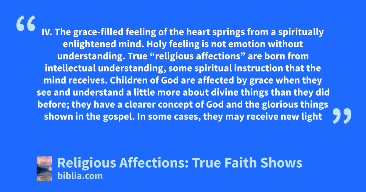 IV. The grace-filled feeling of the heart springs from a spiritually enlightened mind. Holy feeling is not emotion without understanding. True “religious affections” are born from intellectual understanding, some spiritual instruction that the mind receives. Children of God are affected by grace when they see and understand a little more about divine things than they did before; they have a clearer concept of God and the glorious things shown in the gospel. In some cases, they may receive new light